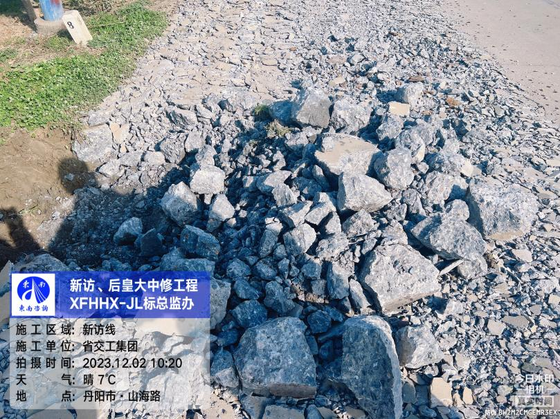 針對這種少見的施工工藝,第六監理部副總親自帶領總監辦全體人員在施工前熟悉圖紙,上網查找類似工程監理經驗,結合設計要求組織崗前培訓,著重要求進行施工過程中的效果檢查;施工過程中六部項目經理帶隊工作組現場指導,對監理工作提出了具體要求。總監辦總監代表、專監、監理員全過程旁站,對破碎粒徑加大頻率的量測,頂面<7.5cm、上部<22.5cm、下部<37.5cm均滿足要求,充分展現監理工作的細致化,得到了建設單位丹陽市綜合交通事業發展中心領導、項目管理組及第三方檢測的一致好評。